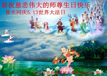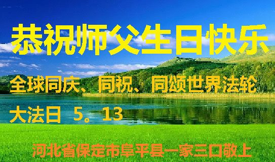 河北保定市一大法弟子恭贺世界法轮大法日!恭祝慈悲伟大的师父生日快乐!师父辛苦了!