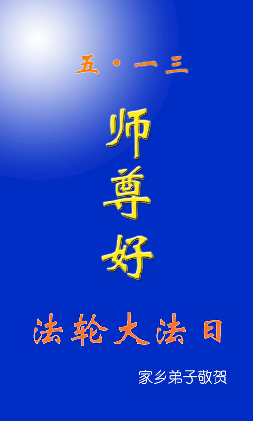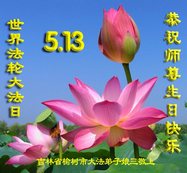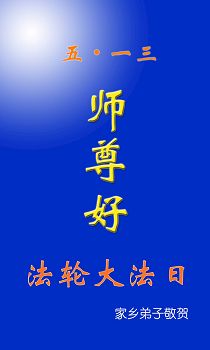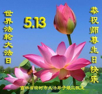 吉林省伊通县一讲真相小组大法弟子恭祝师尊生日快乐!普天同庆5.13世界法轮大法日 师尊您辛苦了! 用尽人类的语言也无法表达浩荡师恩,弟子们只有做好三件事以慰恩师。 叩谢师尊的再造之恩 吉林省长春红旗街一大法弟子及家人恭祝师尊生日快乐!同庆世界法轮大法日!