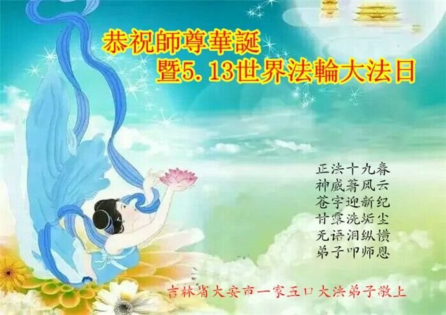 吉林省长春市农安县一家四位大法弟子恭祝慈悲伟大的师尊生日快乐!恭贺第十八届世界法轮大法日暨法轮大法洪传二十五周年!