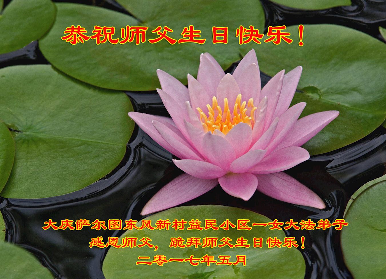 普天同庆“五一三”世界法轮大法日! 恭祝第十八届世界法轮大法日暨师父六十六岁华诞! 法轮大法洪传世界二十五周年! 伟大的师尊您辛苦了!感谢您的慈悲救度!弟子叩谢恩师! 在以后的修炼中,谨记师尊教诲,遇事无条件“向内找”,利用好有限时间,精進实修,做好三件事,兑现史前誓约,随师把家还! 黑龙江省大庆市阳光嘉诚全体大法弟子敬上 黑龙江大庆个体大法弟子恭祝师尊生日快乐!