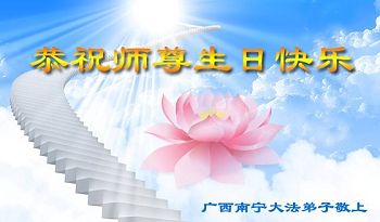 师父,您辛苦了,在这个普天同庆的日子里,用千言万语都无法表达弟子们对师尊慈悲苦度的感激之情。 弟子们唯有谨记师尊的教诲,努力做好三件事,多救人! 广西南宁市大法弟子恭祝师尊生日快乐!庆祝世界法轮大法日!