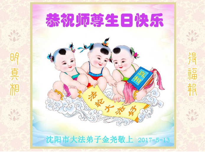 同贺同庆“5.13”世界法轮大法日! 师父,您好! 弟子们心中的伟大日子,“5.13”即将来临之时,借此机会首先向伟大的师父问好!祝师父生日快乐! 回想弟子们的修炼过程,历历在目,没有师父的指引与保护,也就没有我们的今天,也就没有众生得救的机会。 师父的慈悲救度,众生逐渐在清醒中,弟子们在讲真相中就有人说“我为法轮功鸣不平,凭什么打压法轮功”等说法,请师父放心,弟子们在修炼中越来越成熟了,我们要完成自己肩负的责任和史前大愿,不负师尊所望,不负众生所盼,兑现自己的史前誓约,圆满随师还。因为我们心中有法,实践证明在修炼中大法能帮弟子们破除一切障碍。 再次请师父放心!让师父多一份欣慰,少一份操劳;这是弟子们的心愿,多希望能早日见到师父,弟子们想念师父! 叩谢师尊 沈阳部份大法弟子 二零一七年五月十一日 辽宁沈阳铁西姑嫂大法弟子恭祝师尊生日快乐!贺513世界法轮大法日!