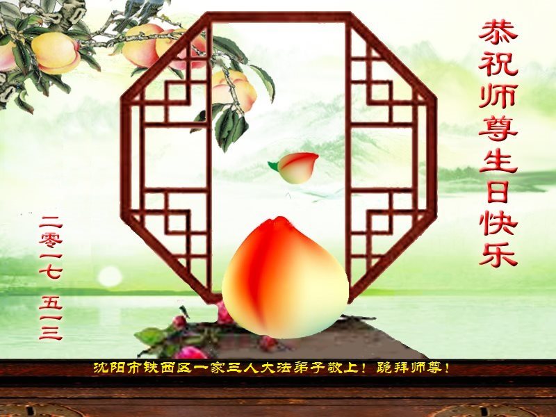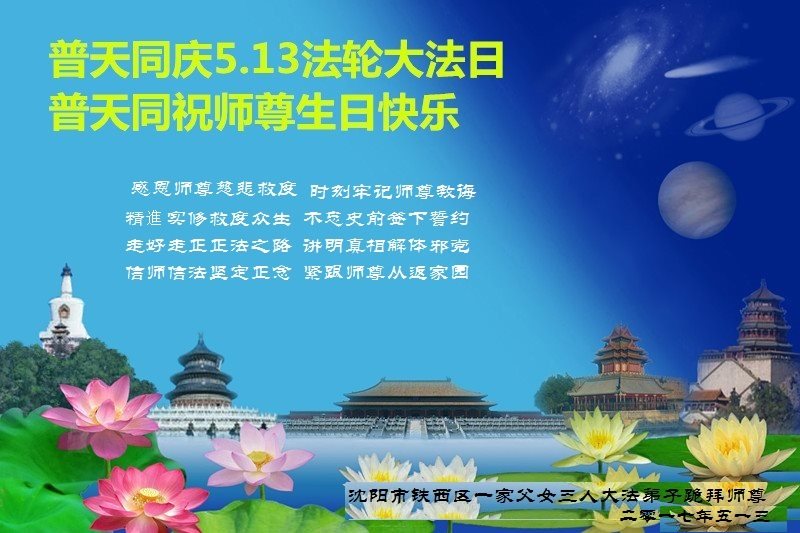 法轮大法洪传二十五周年,普天同庆5.13世界法轮大法日,恭祝师尊生日快乐!感恩师尊慈悲救度! 沈阳市一个家庭三名大法弟子敬拜 难忘师恩 师尊慈悲大法传 幸遇大法笑开颜 生命得救上法船 道德提升天地宽 身心受益诉真言 有缘生命喜得法 人心向善光明显 魔头妒嫉滥用权 红魔打压灌谎言 华夏大地恶浪翻 巨难面前心不变 坚修大法兑誓约 讲清真相破谜团 众生得救上渡船 师尊洪恩颂永远 辽宁省沈阳市铁西区一家三人大法弟子恭祝师尊生日快乐!