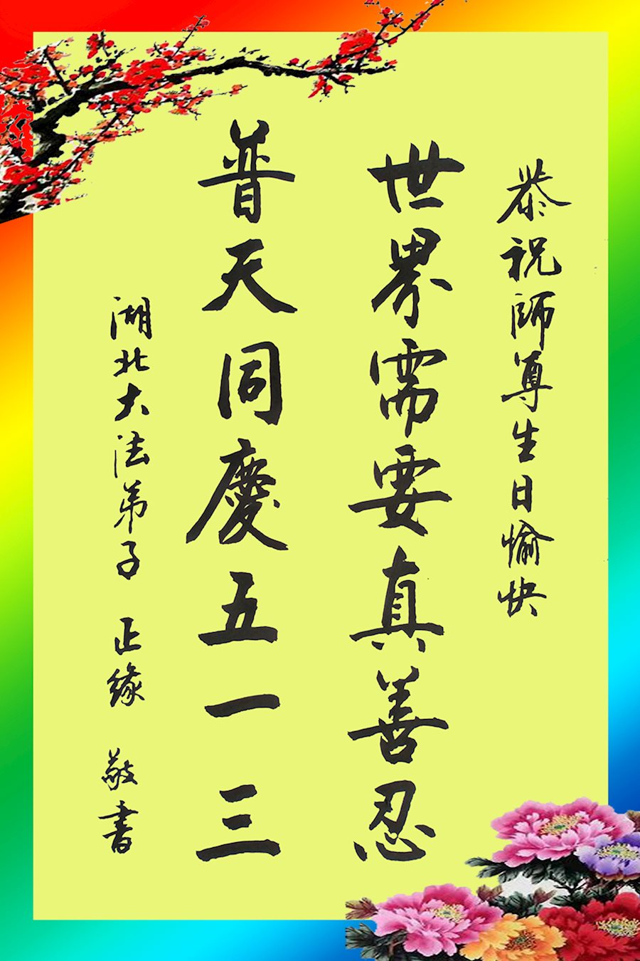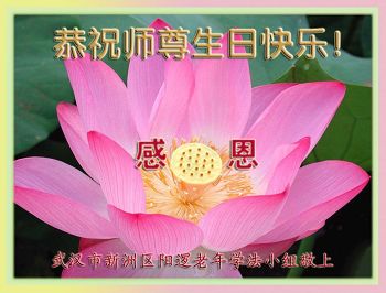 恭贺师尊华诞暨世界法轮大法日!我们学法小组同修多年来克服天气、年龄、环境等诸多障碍,坚持面对面讲真相救度世人,请师尊放心,我们会继续努力精進实修,兑现誓约!祝师尊生日快乐! 四川德阳孝感学法小组敬上 湖北省武汉大法弟子恭祝法轮大法日!即师尊华诞!