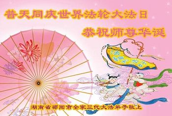 湖南省邵阳市邵东县一家三代全体大法弟子恭贺世界法轮大法日暨师尊华诞!感恩师尊的慈悲苦度,谢谢师父!