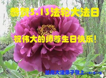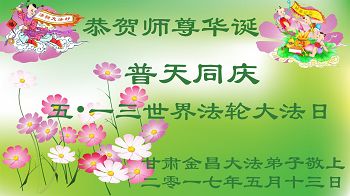 二零一七年五月十三日——一个伟大的日子:世界法轮大法日、法轮大法洪传二十五周年、慈悲伟大的师尊六十六岁华诞! 在这普天同庆的日子,大法弟子真诚的恭祝慈悲伟大的师尊生日快乐!我们真诚的感恩师尊的慈悲苦度,遵循真、善、忍衡量一思一念不断提高心性,圆容整体,互相配合做好三件事,完成救度众生的历史使命,随师回家! 甘肃白银市会宁县一家十口大法弟子恭祝 甘肃省庆阳市一流离失所大法弟子恭贺法轮大法日暨师父传法二十五周年!恭祝师尊生日快乐!