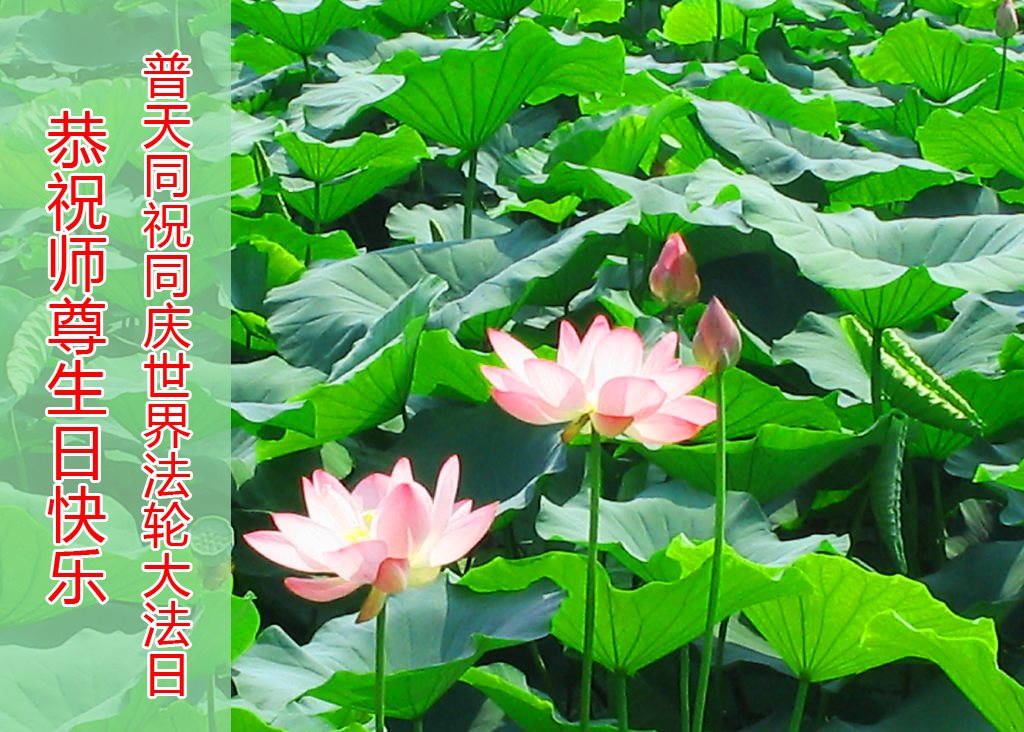 恭祝法轮大法洪传世界二十五周年!第十八届世界法轮大法日暨师父六十六岁华诞! 师父您辛苦了!谢谢您的慈悲救度!弟子一定在这有限的时间里做好三件事!跟师父回家! 重庆市长寿区一大法弟子跪拜师尊 重庆市全体大法弟子恭祝慈悲伟大的师父生日快乐!普天同庆世界法轮大法日!