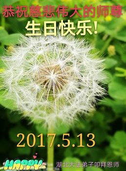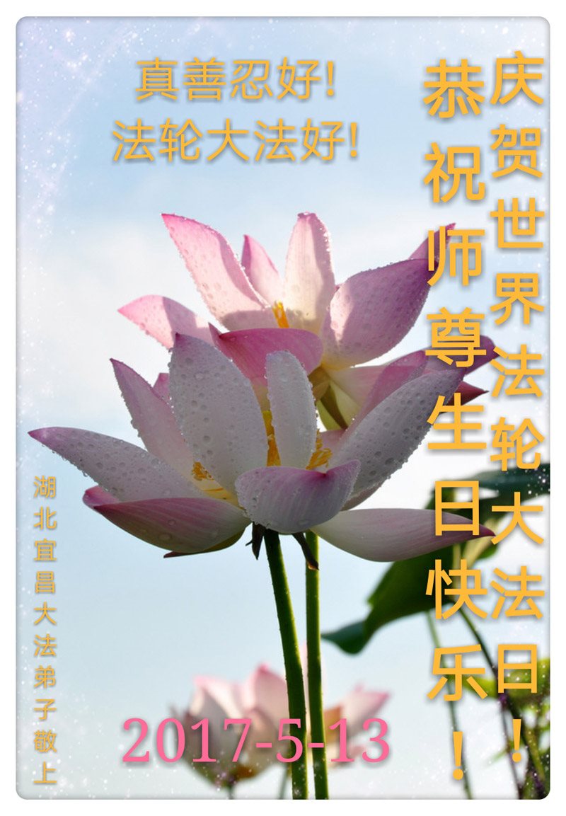 师父您好!您辛苦了!我们学法小组在稳步做好三件事情,希望在以后的三件事情中能做的更好,救人更多,不辜负师父的慈悲苦度,不辜负众生的期盼,完成好自己的誓约。叩拜师尊!感谢师尊的慈悲救度! 湖北大法弟子恭贺法轮大法日!恭祝慈悲伟大的师尊生日快乐!