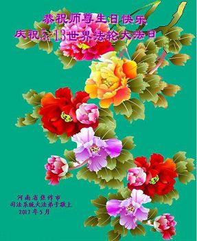 恭祝慈悲伟大的师父生日快乐! 五月十三日是法轮大法日,是师父的生日,是大法弟子们大喜的日子。 我们感恩法轮大法给我们带来的身心巨变,与民众分享修炼真、善、忍的美好和喜悦。 我们慈悲救人是第一位的。最近警察敲大法弟子的门,要大法弟子签字。我想这也是正法進程走到这一步的缘故。也是最后的疯狂。有师在,有法在,我们也不害怕。它们也不是啥,我们正视它、制止它,给他们讲真相,救度他们。 甘肃兰州安宁一大法弟子(八十岁) 2017年5月10日 中国北京公安系统大法弟子及离退休大法弟子恭祝慈悲伟大的师尊节日快乐!敬祝师父生日快乐!