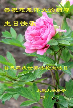 普天同庆513法轮大法日! 感谢慈悲伟大师父对弟子全家的呵护、给予的福份、慈悲救度。师父您辛苦啦!不争气的弟子无法报答师父的救度之恩。弟子唯有精進实修、多学法、多救人、用师父的法要求自己的一言一行、一举一动、做一个合格的正法时期的大法弟子,做好三件事,兑现誓约,跟师父回家。叩拜师尊:合十! 大法弟子 2017年 5月 11日 山西大法弟子全家恭祝师尊生日快乐!
