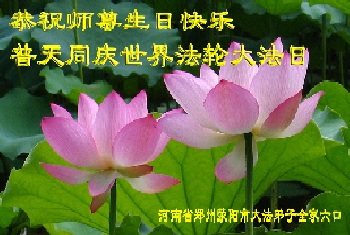 感谢师尊给予弟子二次生命。我定越发抓紧时间,日日时时用心做好三件事,做到修己与救人并重,不辱使命,兑现誓约,回报师尊慈悲苦度之恩。 河南郑州大法弟子恭祝师尊生日快乐!庆祝世界法轮大法日!