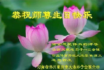 在五、一三世界法轮大法日到来之际,弟子向慈悲伟大的师父问好!我们全体大法弟子想念师父,盼望师父早日回国。我们在师父的加持下一定要做好三件事,学好法,广传真相,多救人,多去人心,修好自己,跟师父回家。 河南省郑州市荥阳市一农村学法小组全体大法弟子恭祝慈悲伟大的师父生日快乐!