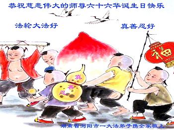 慈悲伟大的师尊:今年是第十八届世界法轮大法日,也是您的六十六华诞,弟子们恭祝您生日快乐! 感恩师尊您为度弟子们无限付出与承受,您辛苦了!我们一定多学法,学好法,互相配合做好三件事以报师恩!谢谢师尊! 湖南省长沙市浏阳市一大法弟子携全家恭祝师尊华诞暨世界法轮大法日!
