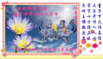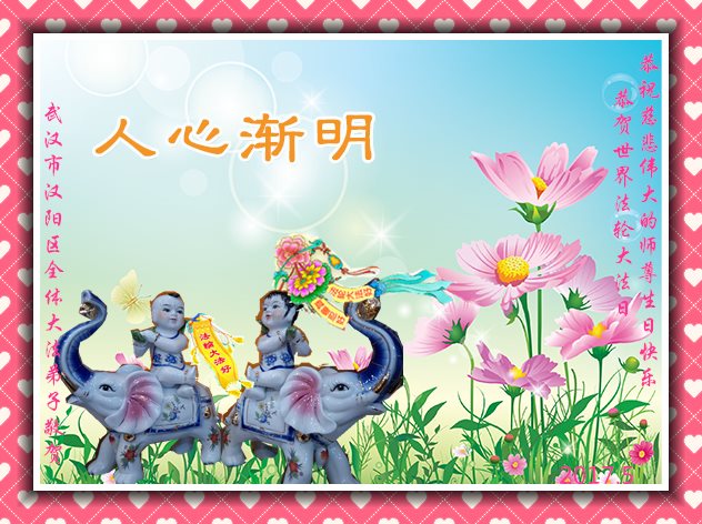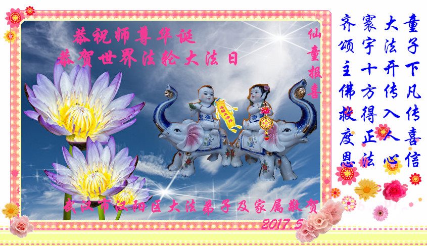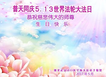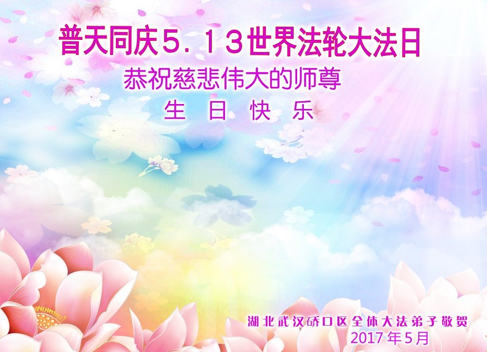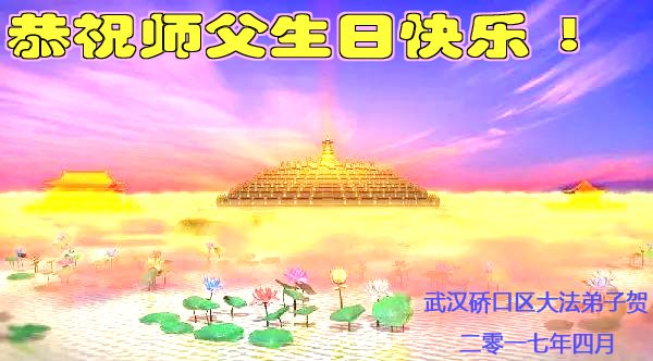 师父: 湖北武汉民航小区学法小组全体弟子祝师父2017年生日快乐!弟子们会更加 精進学法,同时做好三件事。 湖北省武汉大法弟子恭祝师父华诞暨世界法轮大法日!