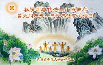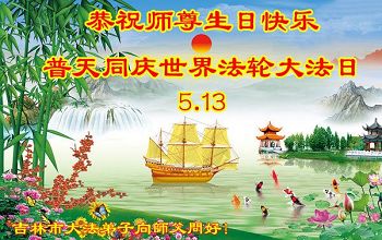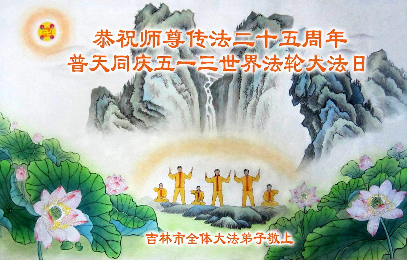 在伟大的师尊传法二十五周年之际,吉林市全体大法弟子恭祝师尊生日快乐!普天同庆五一三世界法轮大法日! 吉林市大法弟子恭祝师尊生日快乐!普天同庆世界法轮大法日!