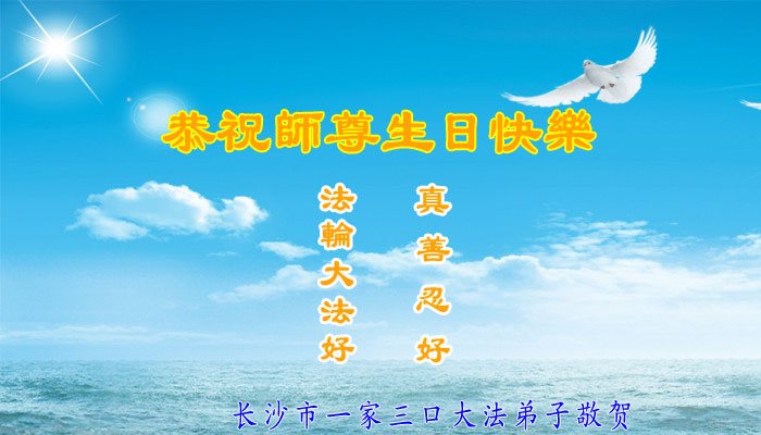 慈悲伟大的师尊:弟子携全家恭祝您生日快乐!感恩师尊您为度弟子的慈悲付出与承受,弟子让您操了无数的心,师尊从没嫌弃弟子,时时点悟提醒弟子要精進做好三件事,并无私的保佑俩个孩子听话懂事、家庭和睦。 我今生能成为您的弟子真的太幸福,我一定要听师尊的话,不管时日长久精進实修,做一名合格的大法弟子以报师恩! 谢谢师尊!跪拜合十! 湖南长沙南区一学法小组全体大法弟子恭贺世界法轮大法日