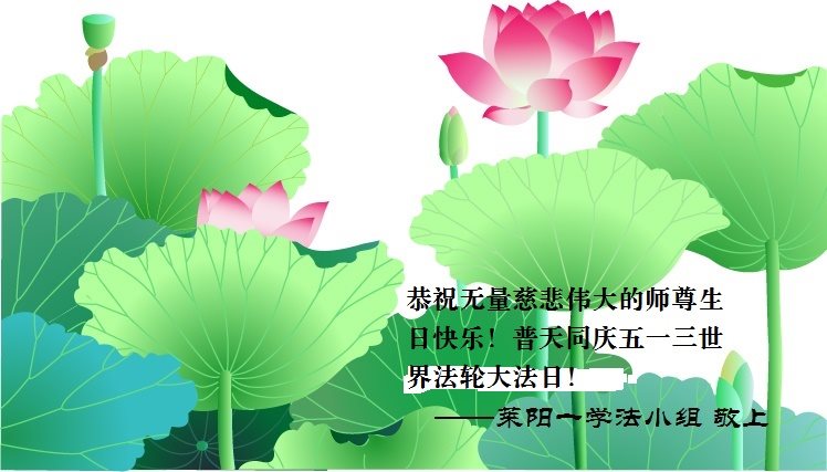 山东烟台莱阳一学法小组全体大法弟子恭祝无量慈悲伟大的师尊生日快乐!普天同庆五一三世界法轮大法日!师父您辛苦了!我们学法小组大法弟子一定配合好,做好三件事,好好学法,多救人,早日跟师父回家。 辽宁铁岭大法弟子全家恭祝师尊生日快乐!