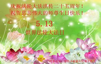 在法轮大法日来临之际,河北省石家庄一学法小组祝师尊生日快乐!我们一定要好好学法,多救人。 河北省衡水市深州市大法弟子恭贺世界法轮大法日!恭祝师尊生日快乐!