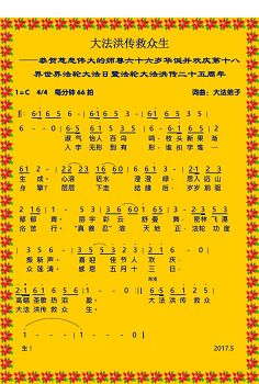 歌词: 大法洪传救众生 ——恭祝慈悲伟大的师尊六十六岁华诞并欢庆第十八届世界法轮大法日暨法轮大法洪传二十五周年 淑气宜人百鸟鸣, 枝头新果渐生成。 心溶近水澄澄绿, 思入远山郁郁青。 层宇彩云舒曼舞, 密林飞瀑振新声。 喜迎佳节人欢庆, 高唱圣歌热泪盈。 入宇无形到有形, 谁担宇难一身擎? 层层下走结缘后, 岁岁前驱浴苦行。 “真善忍”溶天地正, 法轮功度众莲清。 感恩五月十三日, 大法洪传救众生。 大法洪传救众生! 中国大陆大法弟子 叩拜师尊 二零一七年五月九日 山东省菏泽市一学法小组恭祝师父生日快乐!