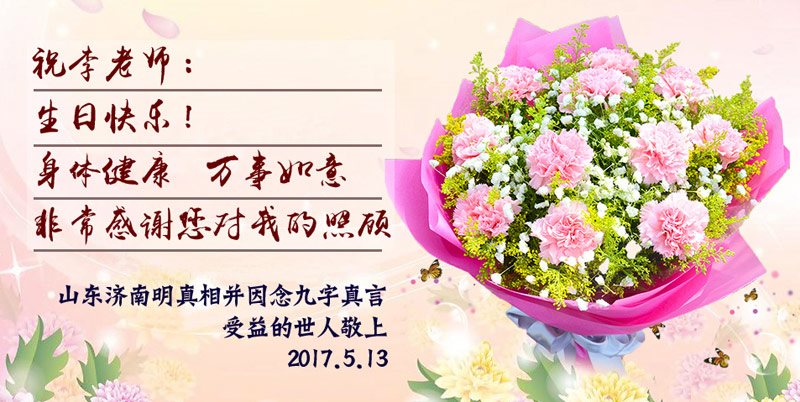 感谢恩师的慈悲苦度,弟子一定做好三件事,走好正法最后的路,完成史前洪愿,不负师恩,圆满随师回归。 再次叩谢师恩! 山东济南市大法弟子合十敬上 2017年5月10日 山东省济南一大法弟子在此恭祝师尊生日快乐!恭贺世界法轮大法日!愿更多世人明真相得救!