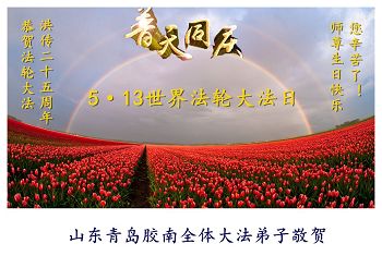 在普天同庆世界法轮大法日之际,山东青岛胶南全体大法弟子恭贺法轮大法洪传二十五周年,恭祝师尊生日快乐!师父您辛苦了! 山东济南一大法弟子及家属恭祝伟大的师尊生日快乐!普天同庆513法轮大法日!