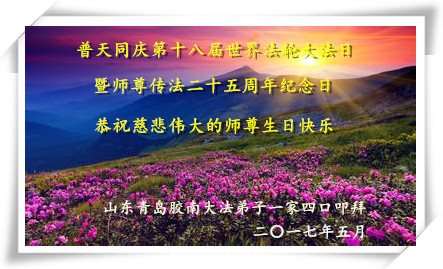 普天同庆世界法轮大法日! 感谢师尊给弟子一个健康的身体,给了弟子第二次生命!弟子会听师父的话,做好三件事多救人,愿师尊多一些欣慰少一些操劳!盼望师尊早日归来! 山东省济南大法弟子全家恭祝师尊生日快乐!