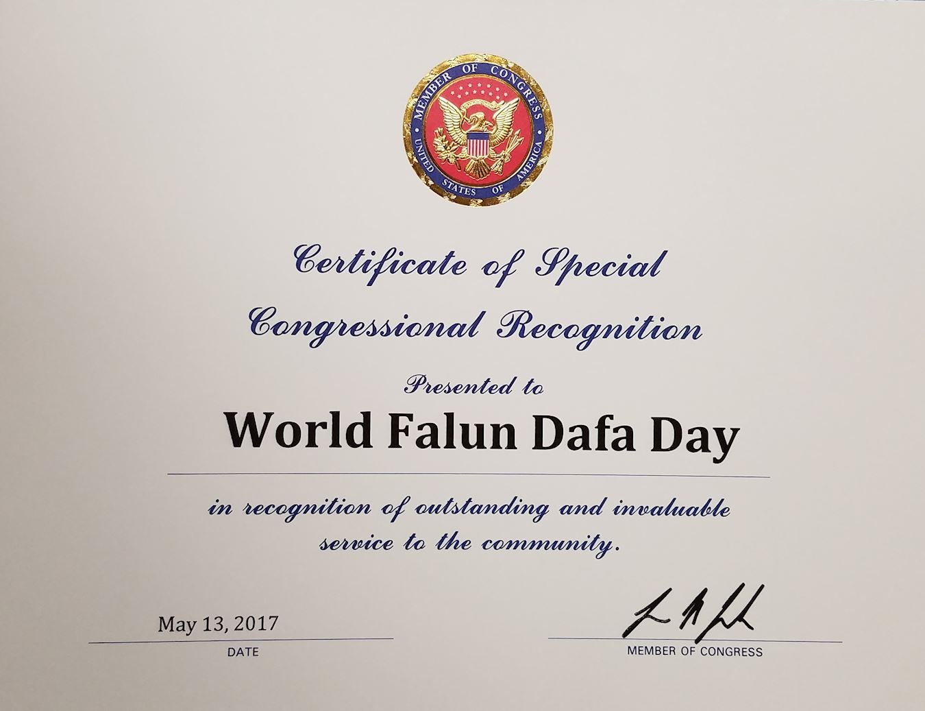 【明慧网二零一七年五月十七日】(明慧记者采菊纽约报道)二零一七年五月十三日,第十八届世界法轮大法日之际,世界各地的法轮功学员以集体炼功,大游行,载歌载舞等各种方式赞颂此普天同庆的神圣节日,值此盛大节日,纽约州一百多位各级政府官员发出褒奖贺信,恭贺法轮大法(又称法轮功)弘传世间二十五周年,同时庆祝第十八届世界法轮大法日。 图1:第一区的国会议员李(Zeldin Lee)发来荣誉证书褒奖“世界法轮大法日” |