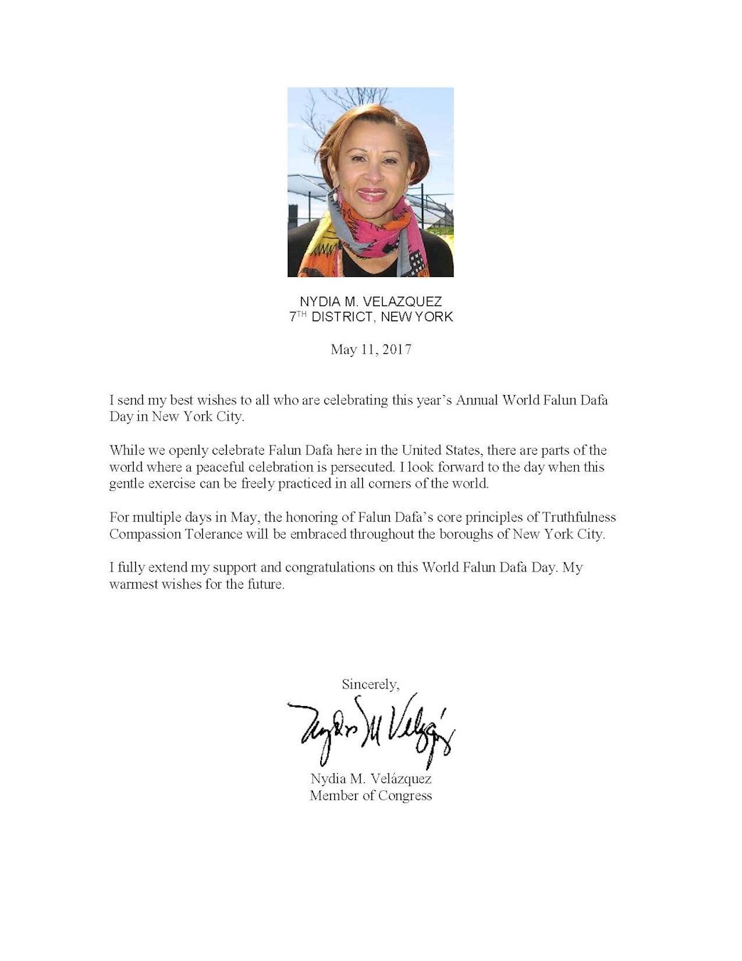 纽约州多位国会议员也发来贺信赞颂法轮大法对人类的贡献。第一区的国会议员李(Zeldin Lee)发来荣誉证书褒奖“世界法轮大法日”。  图2:国会议员贝拉斯克斯(Nadia M. Velazquez)在贺信 |