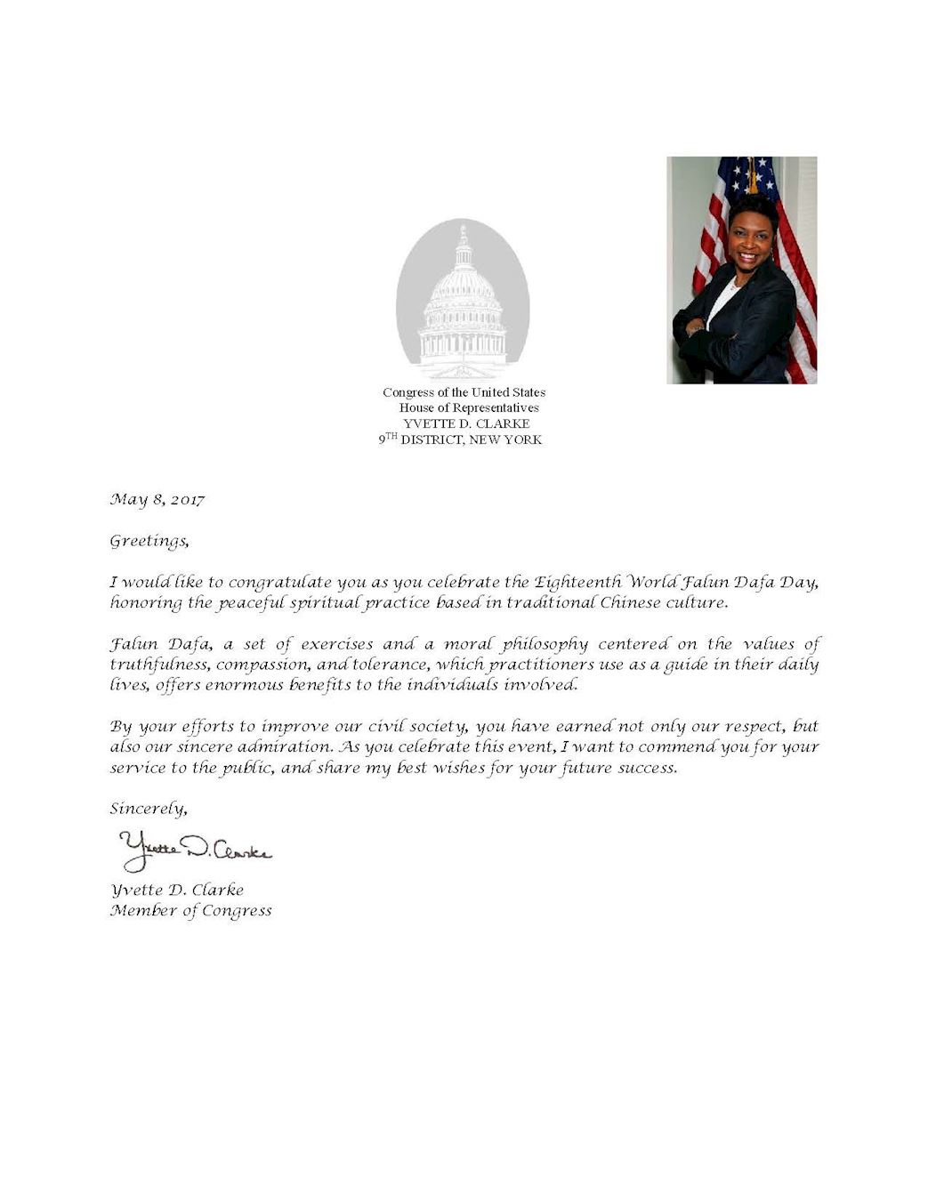 国会议员杰弗里斯(Hakeem Jeffries)在贺信“感谢创始人和精神领袖李洪志先生”中说:“亲爱的朋友们,在第十八届世界法轮大法日的欢迎仪式中,请接受我最热烈的问候。我很高兴有机会向法轮大法创始人和精神领袖李洪志先生表达感谢,并向来自世界各地的修炼者和支持者致意。” “我赞扬法轮功学员的奉献精神,以及他们不遗余力地为社区服务提供服务。法轮功学员组织免费学习班,向纽约市居民提供指导,并表演音乐、舞蹈等中国传统文化。” “通过提供全面的方案,确保社区所有居民能够接触法轮大法平和的精神实践,努力维护和提升他人的生活质量,为社会增加活力。作为国会第八选区代表,我感谢你们的服务和奉献精神。祝你有个美好的庆祝活动。”  图4:国会议员克拉克(Yvette D. Clarke)贺信 |