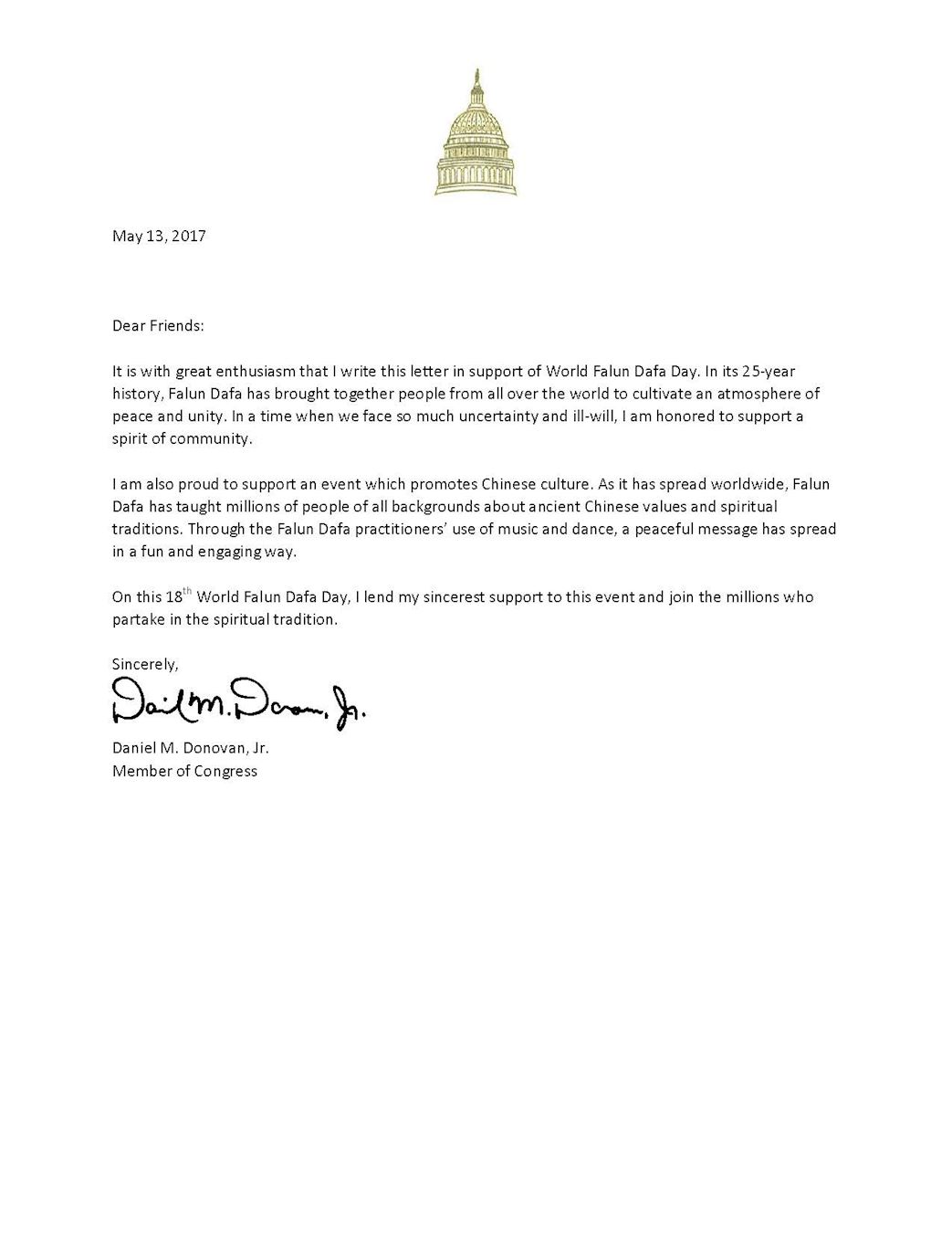国会议员克拉克(Yvette D. Clarke)在贺信中赞扬法轮功“给修炼人带来了巨大的身心受益”。她说:“祝贺你们庆祝第十八届世界法轮大法日,这是基于中国传统文化的和平精神实践。 “法轮大法要求修炼者在日常生活中以真、善、忍为准则,让参与者身心获得巨大提升。 “修炼者努力的改善社会,不仅赢得了我们的尊重,也赢得了我们的真诚赞赏。 当你们庆祝大法日时,我想赞扬你们为公众服务的精神,并祝你们今后成功。”  图5:国会议员多诺万(Daniel M. Donovan)贺信 |