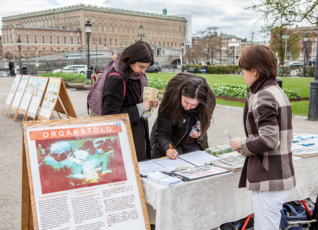 了解真相后的人们在反活摘器官的签名册上签名,支持法轮功学员反迫害。 |