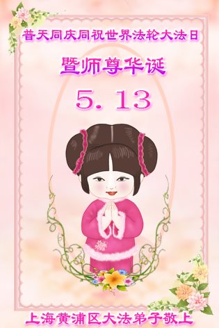 我们夫妻幸运得法修炼十三年,沐浴在师尊的洪大慈悲中,心中无限感恩!在此恭祝师尊生日快乐!希望师尊少一些操劳,多一些欣慰,弟子一定在最后的日子里学好法,多救众生! 上海三大法弟子恭贺法轮大法日!恭祝师尊生日快乐!