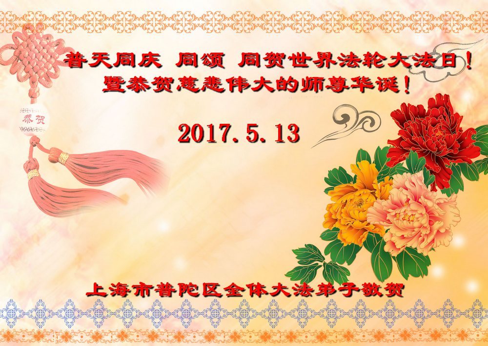 转眼又到二零一七年的五月了,在这普天同庆的日子,我谨代表上海普陀区大法弟子恭贺二零一七年世界法轮大法日!恭祝师尊华诞!普天同庆法轮大法洪传世界二十五周年!弟子在大洋彼岸叩拜师尊的慈悲救度!叩拜大法洪恩!弟子要做好三件事,越最后越精進,让更多的世人知道法轮大法好、真善忍好。弟子合十叩拜师尊! 上海大法弟子夫妻俩祝师尊生日快乐!