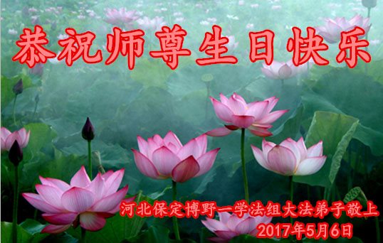 【明慧网二零一七年五月八日】 河北省保定市大法弟子恭祝慈悲伟大的师尊生日快乐!普天同庆5.13世界法轮大法日!