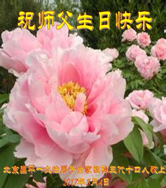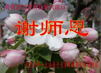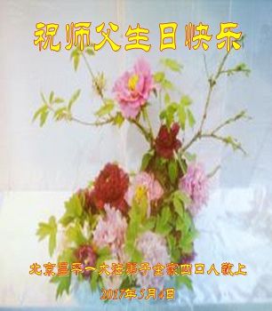 师尊您好: 首先,恭祝师尊生日快乐! 我们是北京昌平的大法弟子。我们一定珍惜师尊为弟子延续来的修炼、救人的宝贵机缘,学好法,修好自己,抓紧时间救人。 弟子一家叩谢师尊 北京昌平一夫妻大法弟子衷心祝愿恩师生日快乐!喜庆二零一七年五月十三日世界法轮大法日!