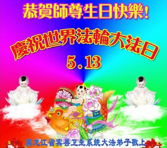 普天同庆大法日 徒儿叩谢师尊恩 勇猛精進不懈怠 功成圆满法船登 黑龙江省哈尔滨市宾县卫生系统大法弟子恭祝慈悲伟大的师父生日快乐!庆祝世界法轮大法日!