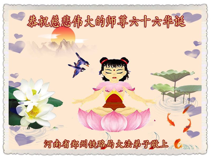 在这天上人间同庆同祝的日子,弟子恭祝慈悲伟大的师尊生日快乐!恭贺世界法轮大法日!恭贺法轮大法洪传世界!弟子想念您!用尽人类的任何语言都表达不尽对师尊的感激!用什么也无法报答师尊的救度之恩!唯有严格要求自己,一定谨记师尊的教诲,时时用法纯净自己,牢记自己的使命与责任,放下一切人心与观念,全盘否定旧势力的安排,从人中走出来,做一位真修弟子,让师尊多一份欣慰,少一份操劳。弟子跪拜合十! 河南省郑州铁路局大法弟子恭祝师尊生日快乐!