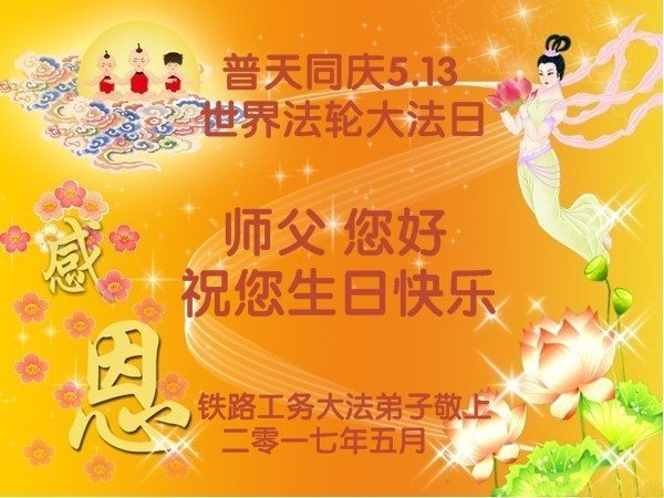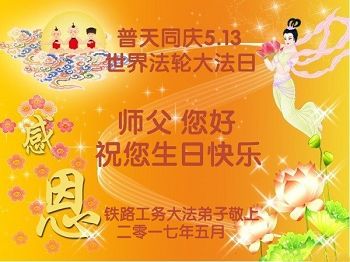 我们是大陆铁路工务部门大法弟子,在五一三世界法轮大法日到来之际,我们非常想念师父,深深的感恩师父!恭敬的祝师父生日快乐!我们与世界同庆法轮大法日!我们按大法的教导维修好铁路,为人民生命安全负责,在铁路上彰显大法的慈悲和光辉,让大法光照环宇! 山西省军工系统大法弟子恭祝伟大的师尊生日快乐!恭贺世界法轮大法日!