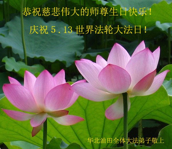 师父好!师父辛苦了!感恩师父对我们这些业力满身、生不如死、从死亡线上救回来。我们这九人当中,有得右肾癌的、有得喉癌的、有得红斑狼疮的(白血病)的,是医院定了死刑的人,其余的都是得的难治之症。我得法炼功后不久,我所有的疾病不治而飞,快二十年没吃一分钱的药。师父慈悲!不断的净化了我们的身体!也净化了我们的心灵!还净化了宇宙、天地、万事万物!师父操尽人间事,劳心天上苦,师父给予我们太多太多!承受太多太多!师恩浩荡救度众生,用尽人间语言也无法表达师父对我们的苦度,千言万语汇成一句:师父好!师父辛苦了!这是来自心灵深处的一种真诚的感恩,因为我们很荣幸被师父选中,我们从遥远的天体随师层层下走,来到人间,成为正法时期的大法弟子;我们很荣幸,我们能够在这个特殊的历史时期和师父同在,能够完成助师正法,救度众生的使命。我们更应该做好三件事,讲真相、救世人,兑现誓约。迎接师父回国团聚,是每个大法弟子的心愿!我们的一句肺腑之言:唯有精進、再精進,才能报答恩师慈悲苦度,珍惜这最后的正法时光。 华北油田全体大法弟子恭祝慈悲伟大的师尊生日快乐!庆祝世界法轮大法日!