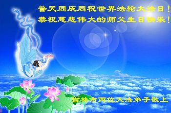 带着春的回味和夏的生机,在这春暖花开的五月,我们又迎来了三个最伟大的节日——慈悲伟大师尊的六十六岁华诞!第十八届“世界法轮大法日”!法轮大法洪传世界二十五周年! 在这感恩的日子里,我们三姐妹怀着深切的喜悦与感恩恭祝师尊生日快乐!恭贺世界法轮大法日!法轮大法洪传世界二十五周年! 用蓝天做纸,海水做墨也写不尽我们对师尊的无限感恩!千言万语汇成一句话,那就是谨记师尊的教诲,珍惜这万古修炼的机缘,时时刻刻记住自己是正法时期的大法弟子,向内找,一思一念修自己,更加精進的做好三件事,不辜负师尊的慈悲苦度,喜迎师尊回故乡。 吉林省吉林市三姐妹跪拜敬上! 吉林市两位大法弟子恭贺法轮大法日!