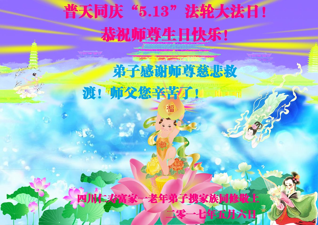 普天同庆“5.13”法轮大法日! 弟子感谢师尊慈悲救度!师父您辛苦了! 四川仁寿富家一老年弟子携家族同修敬上 二零一七年五月六日 四川省达州市开江县姐妹俩大法弟子恭祝伟大师尊生日快乐!