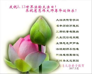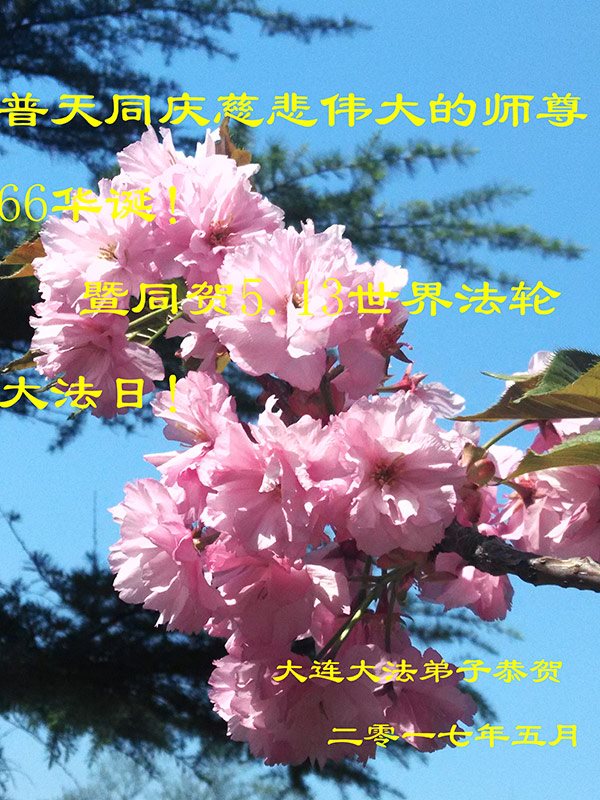 恭祝慈悲伟大的师尊生日快乐!同庆法轮大法洪传二十五周年! 弟子想念师尊!师尊辛苦了! 感恩师尊的慈悲救度,珍惜师父开创的万古不遇的正法机缘,听师父的话,珍惜已经走过的修炼道路,修好自己,多救人圆满跟师父回家! 大连一大法弟子合十跪拜师尊! 2017/5/4 辽宁省大连市一大法弟子庆祝“五一三世界法轮大法日”恭贺伟大的师尊六十六华诞!
