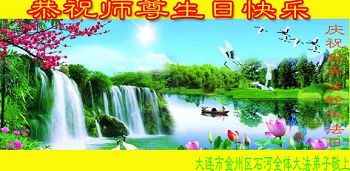 大法洪传苍宇间 艰辛历经万魔拦 正邪较量难阻挡 众生沉沦迷双眼 师尊慈悲声声唤 法徒助师不怕难 机缘难得莫错过 定随圣王返家园 辽宁省大连市金州区石河全体大法弟子恭祝师尊生日快乐!