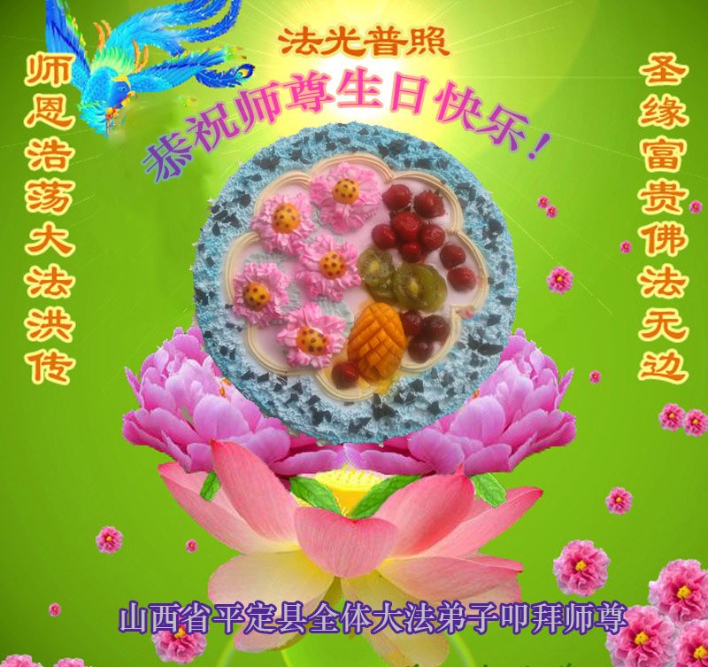 山西省阳泉市平定县观澜小区大法弟子恭祝慈悲伟大的师尊生日快乐!