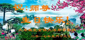 【明慧网二零一七年五月八日】 山西省太原大法弟子恭祝慈悲伟大的师尊生日快乐!跪拜师尊!庆贺世界法轮大法日!