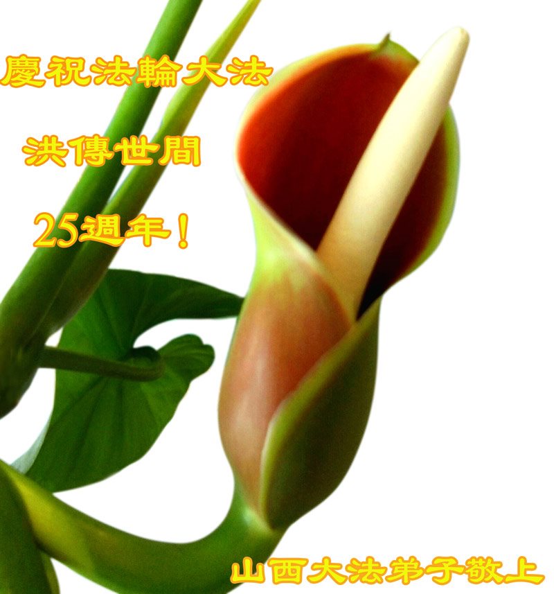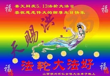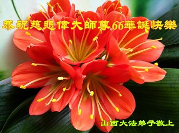 恭祝慈悲伟大至尊至上的师尊66华诞快乐! 庆祝法轮大法洪传世界25周年! 1992年5月13日这个伟大的日子,将在历史的长河中世代永传。伟大的5·13给予我们每一个法轮大法修炼者以无限的厚爱和慈悲,在师尊的引领下,我们在风雨中走到今天。一路走来,师尊的艰辛与付出撒满这人间的一草一木,一山一水。“正法传 难上加难”(《洪吟》〈难中不乱〉),我们深深的感恩师尊在正法中的艰难付出与对世上每一个生命的无量慈悲,师尊您辛苦了!我们发自内心的感恩慈悲伟大的师尊!感恩5·13! 我们唯有勇猛再精進,做好三件事,修好自己,多救人。 再一次恭祝慈悲伟大的师尊66华诞快乐! 跪拜师尊! 山西大法弟子敬上 山西大法弟子恭贺法轮大法日!
