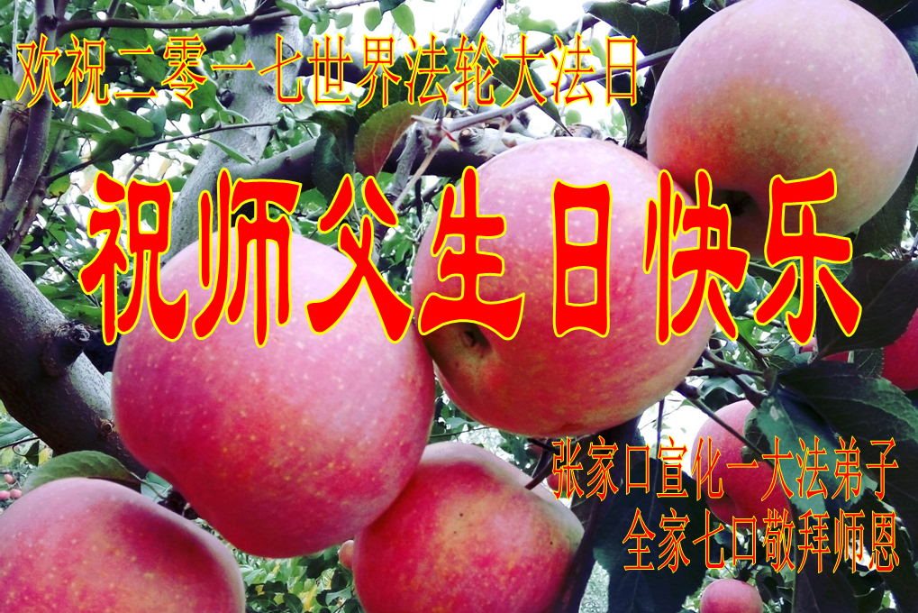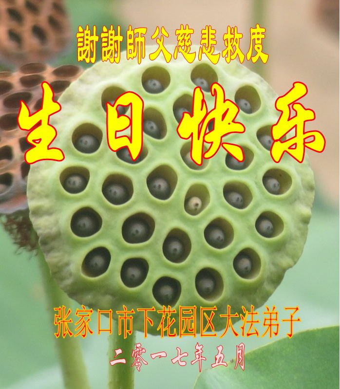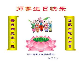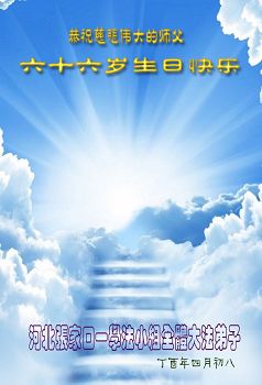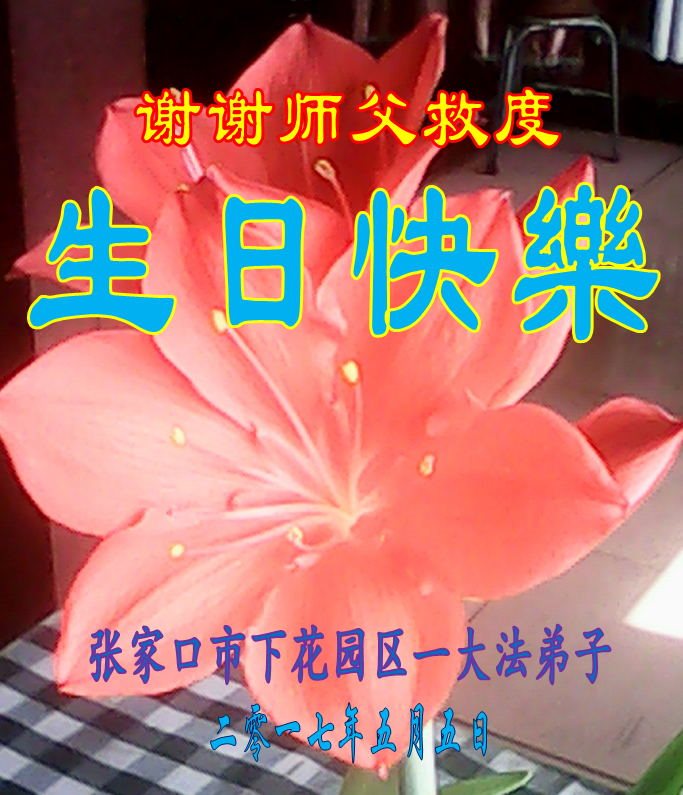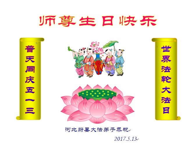“天上人间同庆贺,感恩师尊救大穹,精進实修多救人,返本归真兑誓约。” 我们再祝师父生日快乐!我们要放下人心转变观念抓紧修好自己,遇事向内找,把没有修好的方面赶快修好,把不完善的事情赶快圆容好,做好三件事,讲清真相多救人。 涿鹿县全体大法弟子合十: 感恩师尊慈悲苦度! 2017年5月3日 河北省张家口市涿鹿县大法弟子恭祝师尊生日快乐!