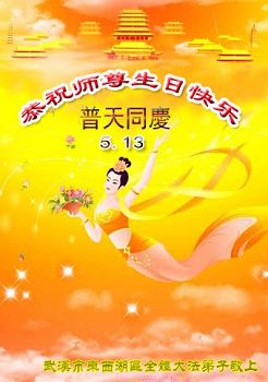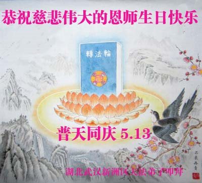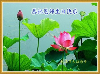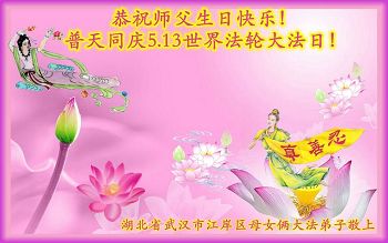 师尊您好!我们是武汉市一学法小组的大法弟子,弟子非常想念您。在“五一三”世界法轮大法日,暨慈悲伟大的师尊六十六华诞即将来临之际,我们谨以无比崇敬的心情,恭祝慈悲伟大的师尊生日快乐!庆祝寰宇众生神圣的节日! 请师尊放心,我们一定不会辜负师父对弟子的期望,牢记师尊的嘱托,扎扎实实做好三件事,抓紧这最后的时机救度更多众生,把法轮大法的美好带给世人,走好师尊为弟子安排的路,以弟子修炼的成果迎接新宇宙的伟大圆满,弟子惟愿师尊笑! 湖北省武汉市江岸区学法小组大法弟子 叩拜 湖北武汉市新洲区大法弟子恭祝师尊生日快乐!