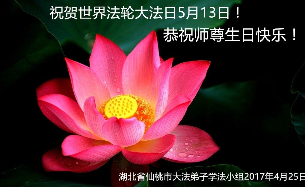 二零一七年五一三是慈悲伟大的师尊华诞暨第十八届世界法轮大法日和法轮大法洪传二十五周年之际,湖北省嘉鱼县全体大法弟子同祝、同颂、同庆。师尊,是您将我们从地狱中捞起;是您帮我们净化身体;是您将宇宙大法传予我们;是您时时刻刻呵护着弟子;是您牵着我们的手一步一步从人走向神。师尊,您的洪恩,弟子们用尽人类的语言无法形容,也无法表达,唯有精進实修,了却救度众生的洪愿,才能不负师恩。在宇宙正法的最后时刻,在这一刻值千金,值万金的最后关头,弟子们一定做到真正去学法,在法上提高;用大法去指导自己的思想、言行,抓住一思一念向内找,真正修自己;与此同时全力以赴救度众生,兑现誓约,不负万古机缘。 湖北省咸宁市大法弟子恭祝慈悲伟大的师尊华诞暨世界法轮大法日和法轮大法洪传世界二十五周年!