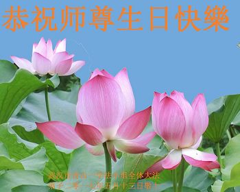 在这世界法轮大法日将近的时刻,我们万分感恩师父慈悲看护与救度!师父您辛苦了!您用巨大的付出替众生承受着一切,弟子谢谢师父!弟子及全家人祝师尊生日快乐!时光如梭,回首流失的光阴,弟子愧对师尊,弟子还有执着没去尽、还有正念不足、还有誓约没兑现、师父心急,弟子也心急。作为弟子,唯有听师父的话,紧跟师父走,溶于法中,全盘否定旧势力的邪恶安排,排除一切干扰与破坏,理智清醒走正修炼路,踏踏实实的走好最后的路,修好自己,多救世人,早日跟师父回家! 湖北省武汉市一大法弟子率全家三代人恭祝师父生日快乐!
